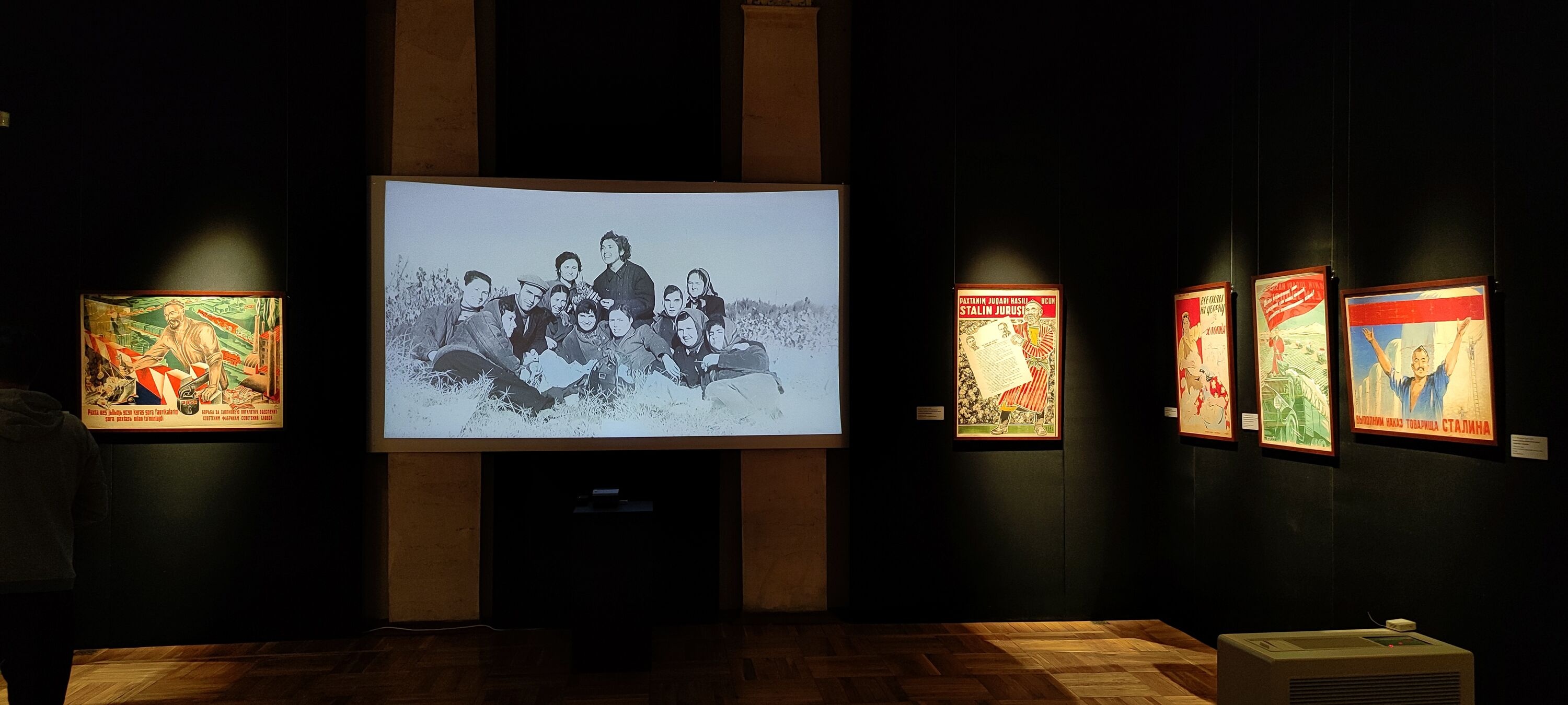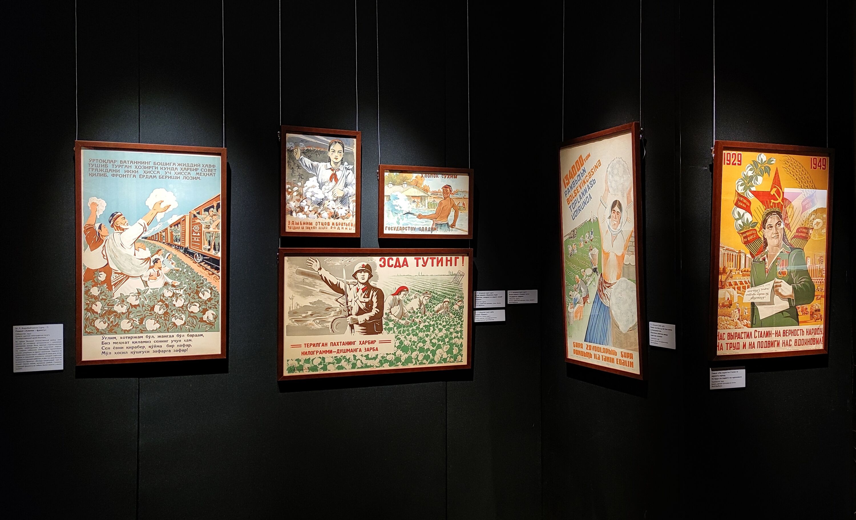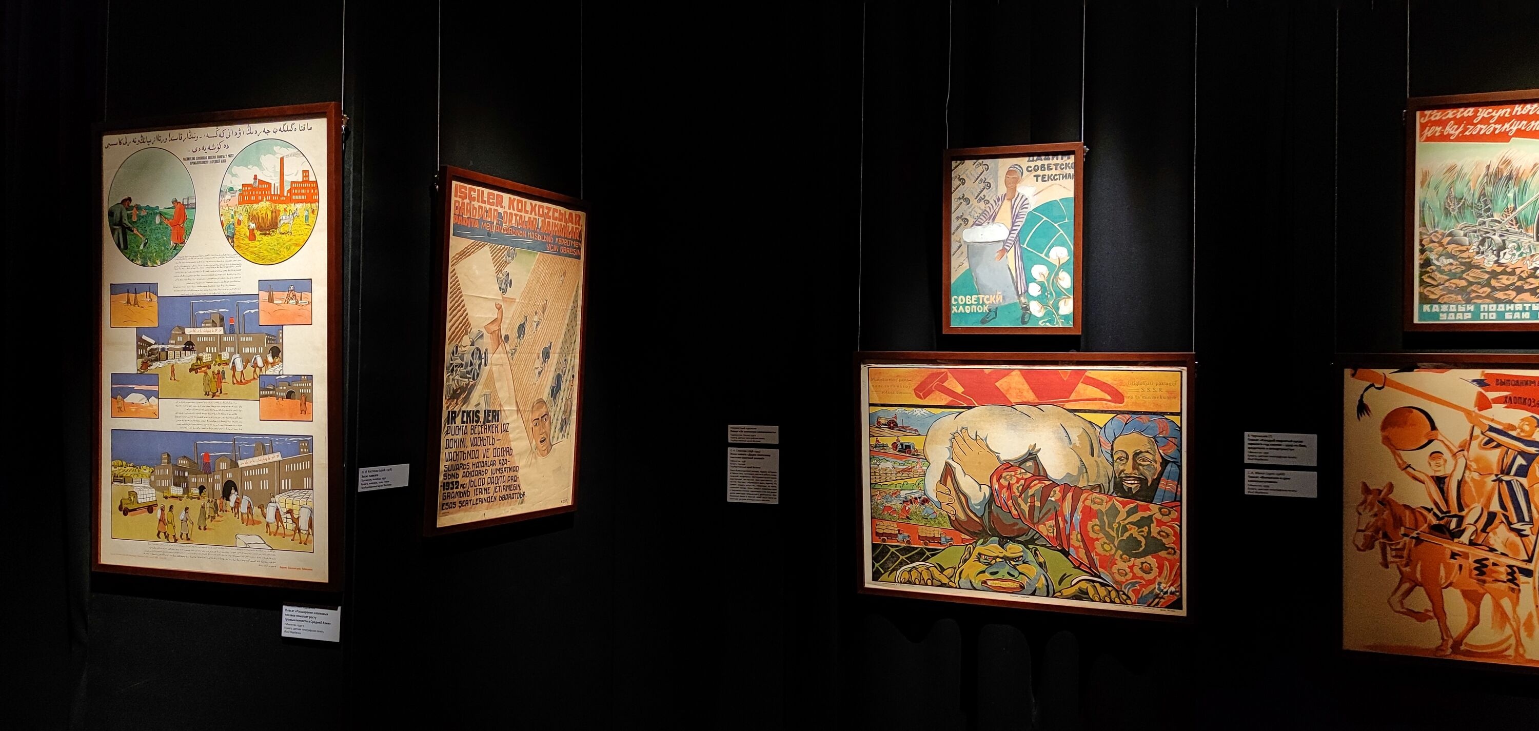 Часть выставочного пространства отдана плакатам, выполненным в 1930-1970-е гг. Кроме тиражных печатных листов здесь представлены и авторские эскизы А. Николаева, О. Соколовой, С. Беглярова - выдающихся художников, оставивших след в истории живописи республик Средней Азии.
