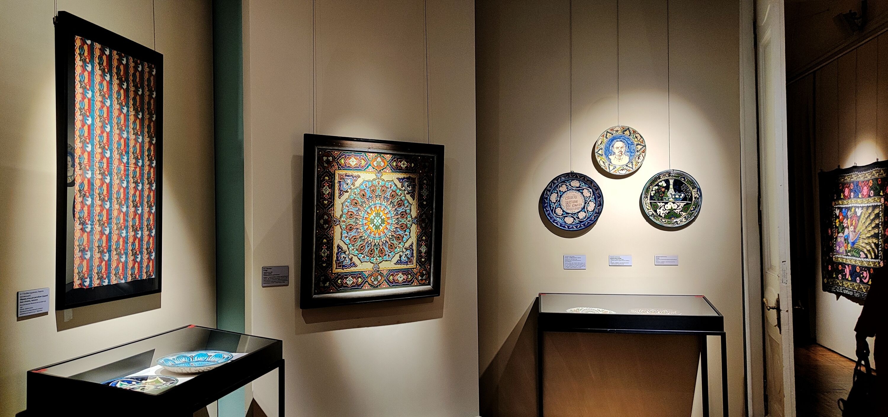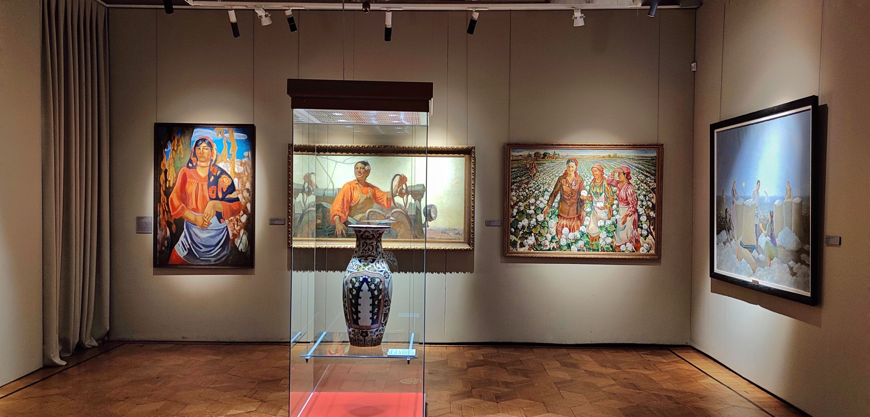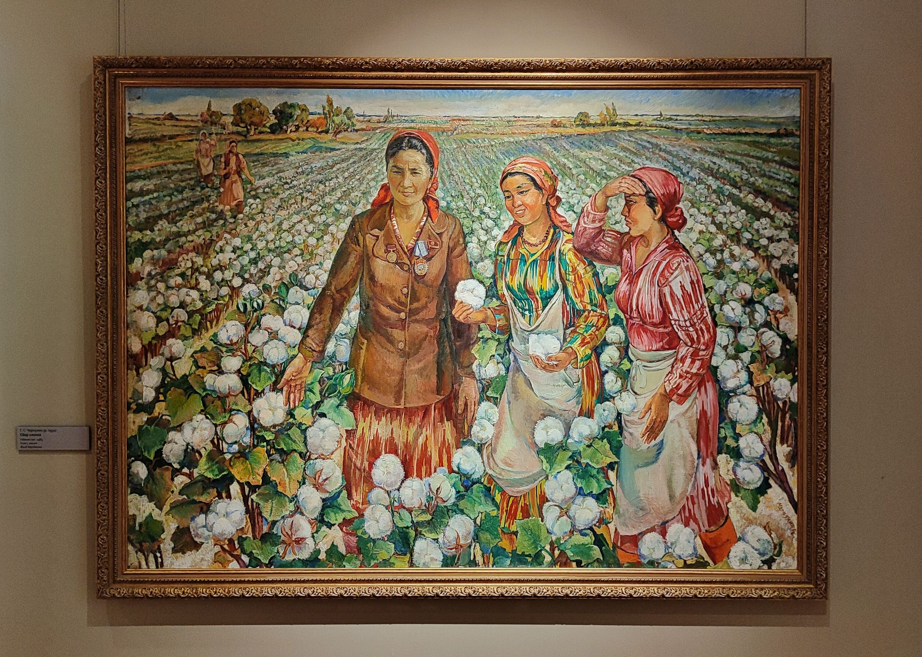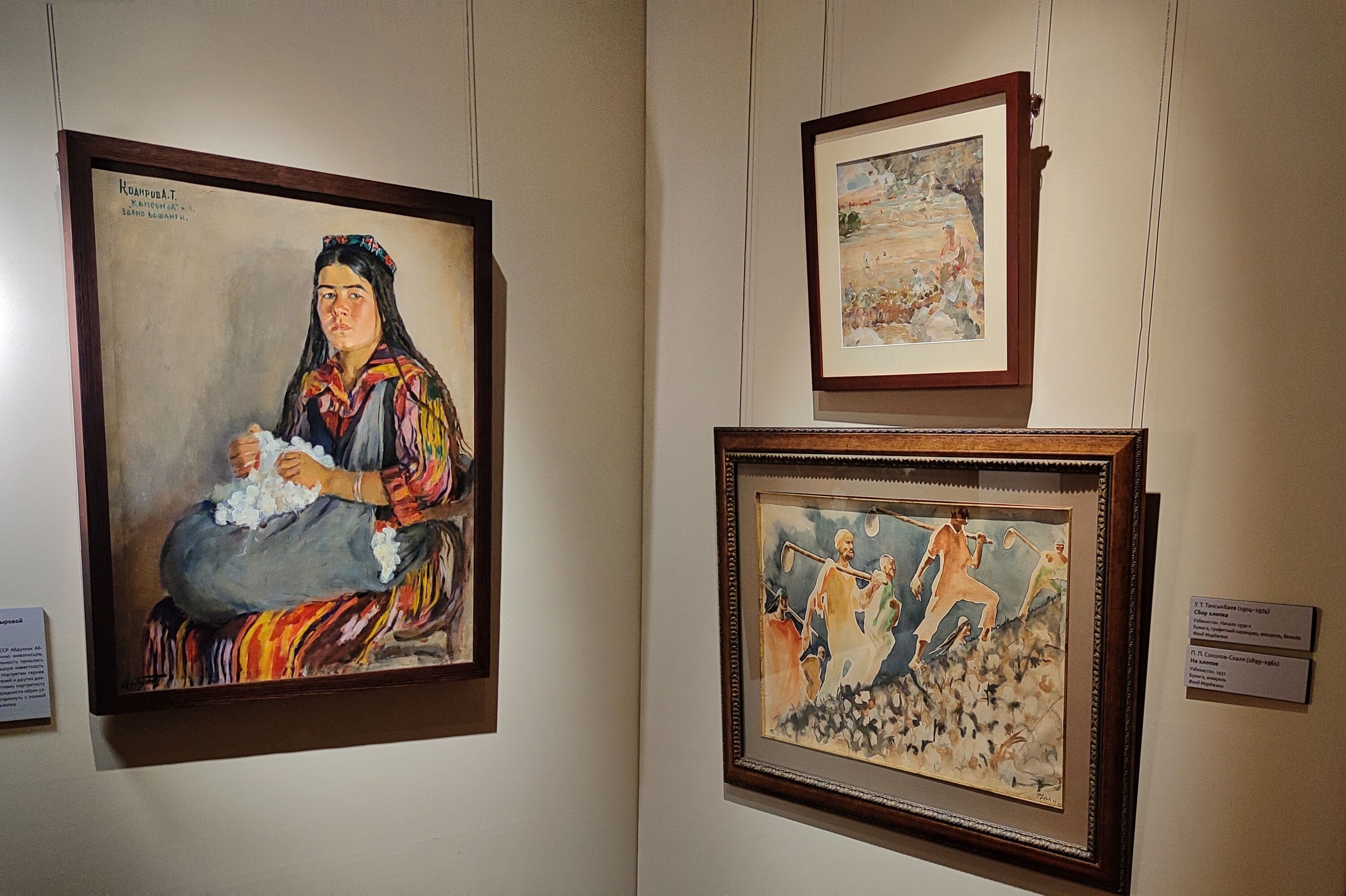 В одном из залов собраны разнообразные предметы с изображениями хлопка: декоративные панно, керамические блюда, вышитые покрывала, золотошвейная бухарская тюбетейка, уникальное туркменское украшение, демонстрирующие, как хлопок превращался в сакральный советский символ.