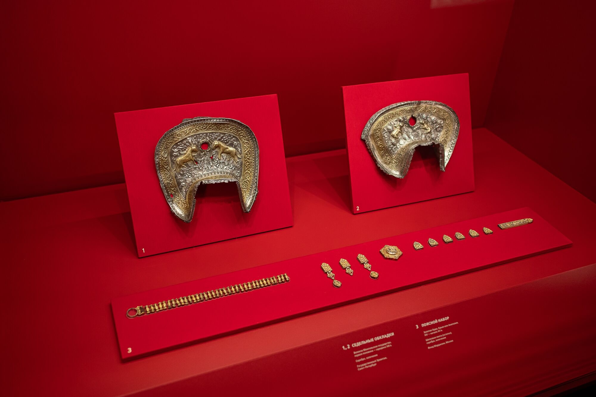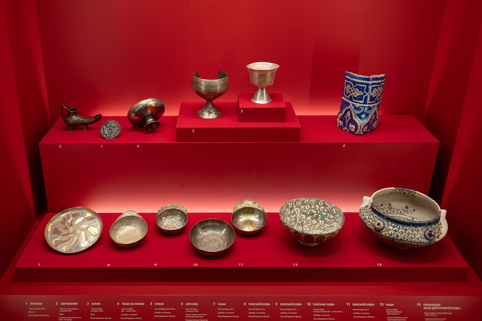 Экспозиция включает более 150 предметов из ведущих отечественных музеев, библиотек и частных собраний. В ней представлены памятники, достоверно связанные с потомками Чингисхана при русском дворе, в том числе футляр для Корана касимовского царя Ураз-Мухаммеда из Государственного Эрмитажа, драгоценная фляга-сулея, подаренная касимовским царевичем Сеид-Бурханом царю Алексею Михайловичу, и науз (деталь конского убранства) – дар Авган-Мухаммеда, служилого царевича из Ургенчской династии, из собрания Музеев Московского Кремля. Некоторые предметы посетители увидят впервые. Среди них поясной набор из множества золоченых накладок из собрания Фонда Марджани, принадлежавший ордынскому аристократу, и рукопись XVII века «Джами ат-Таварих» («Сборника летописей») из Научной библиотеки Санкт-Петербургского государственного университета. В этом сочинении, созданном при дворе касимовского царя Ураз-Мухаммеда, царь Борис Годунов сравнивается с Чингисханом.